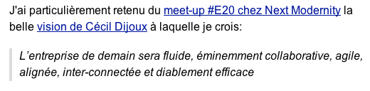 Cette réflexion va «booster» le renouveau des intranets et des espaces collaboratifs, possible anticipation de la «digital workplace» de demain.