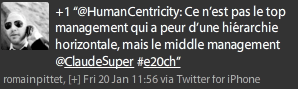 Et enfin, il y a Julien Cotteau qui la semaine dernière publiait un billet très intéressant à propos du Dialogue social 2.0 que je vous recommande et qui vient mettre en perspective l’entreprise de demain (une réflexion en profondeur plus qu’en complexité).