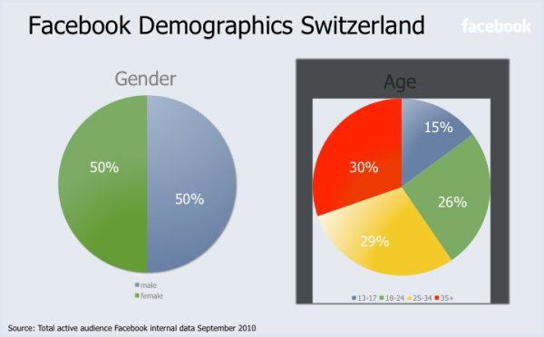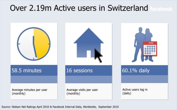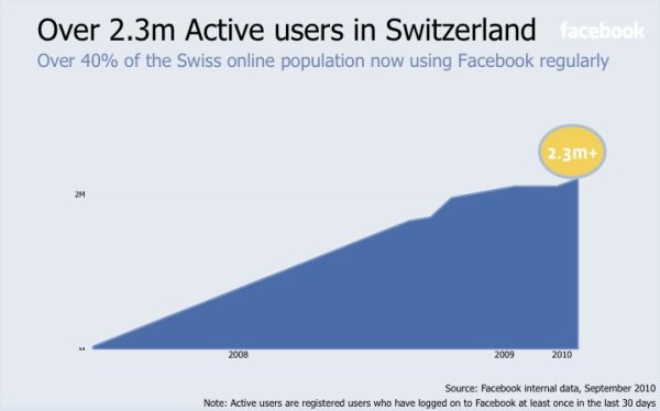 Les suisses sont également des adeptes des médias sociaux : selon le site socialbakers, il y a plus de 2’750’000 utilisateurs de Facebook en Suisse, ce qui représente 38% de la population totale et 48% des internautes.
