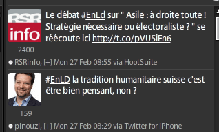 Audacieuse, intelligente et nullement prétentieuse, cette initiative baptisée « En Ligne directe » conjugue les outils traditionnels de ce média (RSR La Première), les médias sociaux (Twitter) et des applications qui permettent à tout à chacun d’apporter sa contribution au débat à partir de son smartphone.