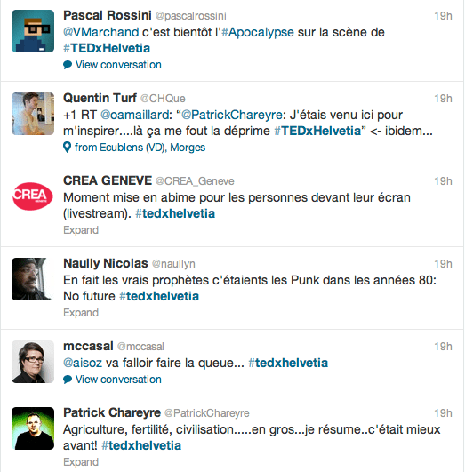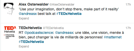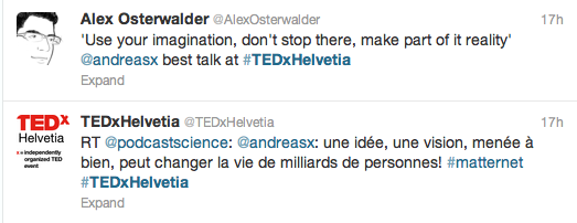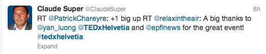 Convié avec notamment @sdufaux @CHQue @yseult @PatrickChareyre @VMarchand @aisoz @alanvonlanthen @relaxintheair @yan_luong @mccasal à « relayer » le TEDxHelvetia organisé sur le thème « Imagining Our Future » le 13 septembre par l’EPFL, la Fondation Lomboard Odier et l’Alumni EPFL, je ne peux que vivement les remercier pour la qualité de cette soirée.