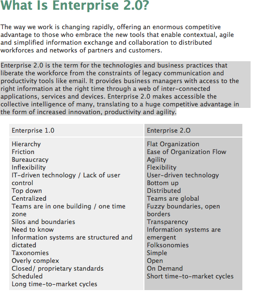 Enterprise 2.0 is the term for the technologies and business practices that liberate the workforce from the constraints of legacy communication and productivity tools like email. It provides business managers with access to the right information at the right time through a web of inter-connected applications, services and devices. Enterprise 2.0 makes accessible the collective intelligence of many, translating to a huge competitive advantage in the form of increased innovation, productivity and agility.