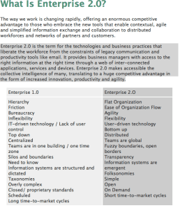 Si on en juge par les définitions de l’entreprise 2.0 qui fleurissaient il n’y pas encore si longtemps sur le web, rien n’est moins sur ! En 2009, à l’occasion de la conférence E 2.0 de Boston, à la question What’s Enterprise 2.0, la réponse était: