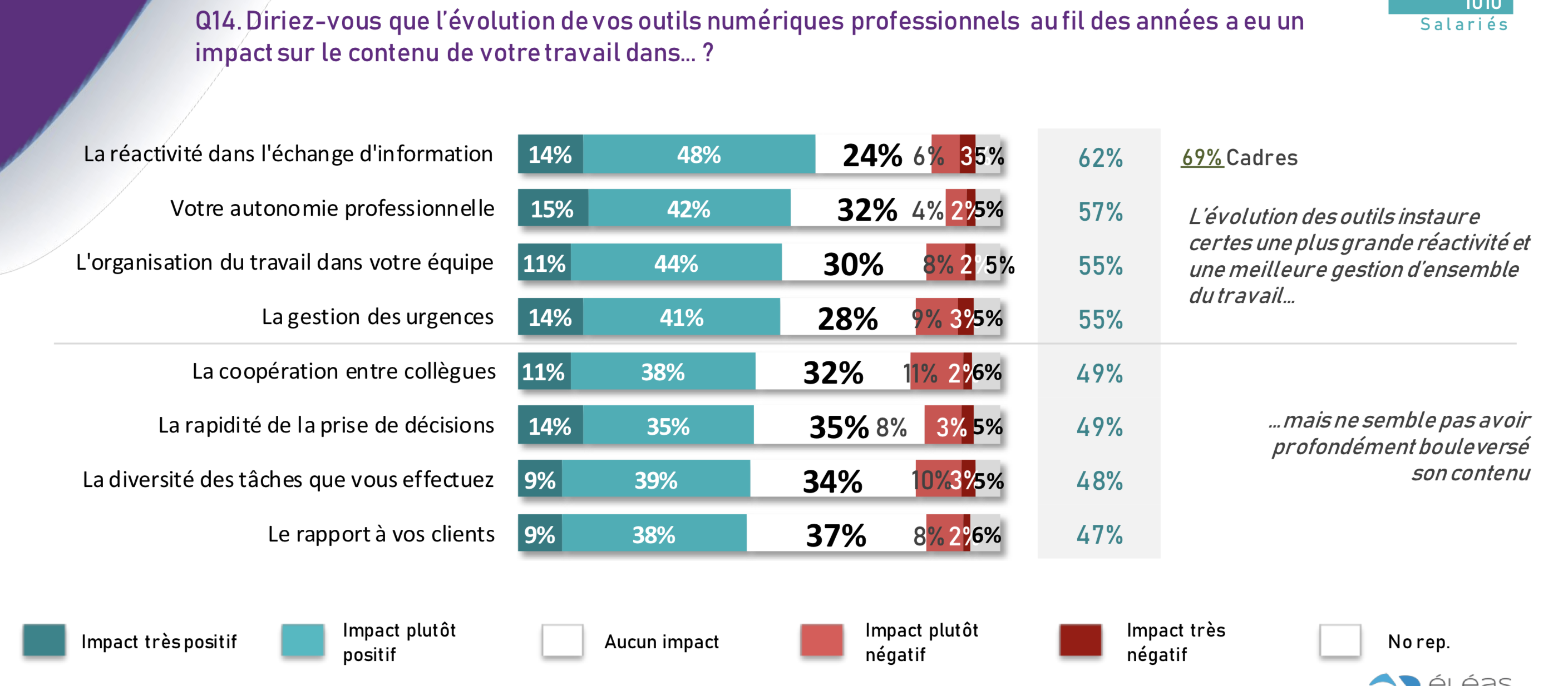 En dehors cet aspect, les collaborateurs (cadres et non cadres) sont plus circonspect quant aux outils numériques et ils sont nombreux à les juger négativement même si certains apprécient le plus de réactivité !