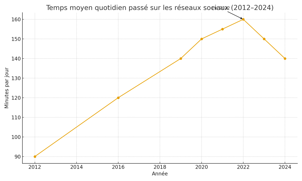 Figure 1 – Temps moyen quotidien passé sur les réseaux sociaux (2012–2024). Source : GWI / Financial Times, 2024.