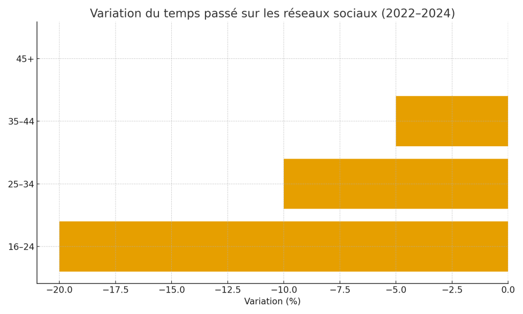 Figure 2 – Variation du temps passé sur les réseaux sociaux par tranche d’âge (2022–2024). Source : GWI / Financial Times, 2024.