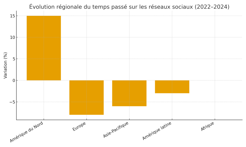 Figures 3 – Évolution régionale du temps passé sur les réseaux sociaux (2022–2024). Source : GWI / Financial Times, 2024.