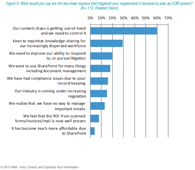 Toutefois, il est important de se rappeler que l’enquête a porté sur les organisations de toutes formes et dimensions et il est possible que les organisations n’utilisant une solution ECM sont les entreprises de plus petite taille (le rapport ne fait pas cette distinction).