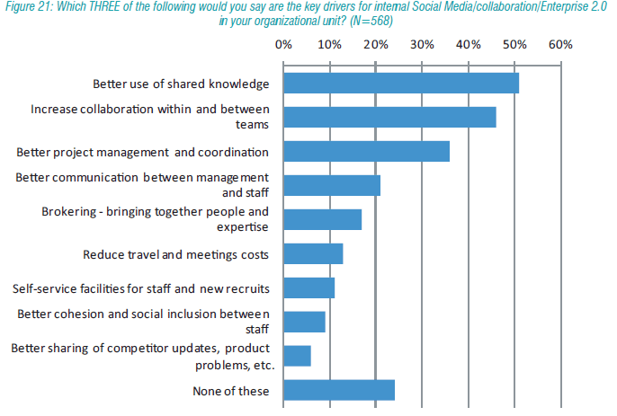 Il est intéressant de noter que la notion de collaboration n’est pas mentionnée d’une manière explicite bien que la raison numéro deux est «maximiser le partage des connaissances dans une entreprise où les ressources sont dispersées ».